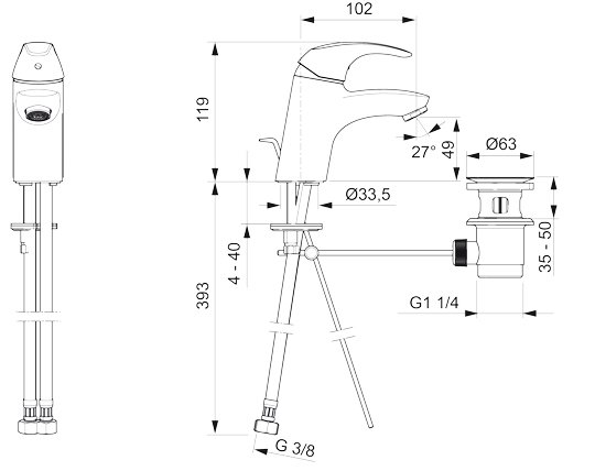 - Описание Смеситель для умывальника с донным клапаном, фиксированным изливом и аэратором. Со встроенными опциями ограничения температуры воды.