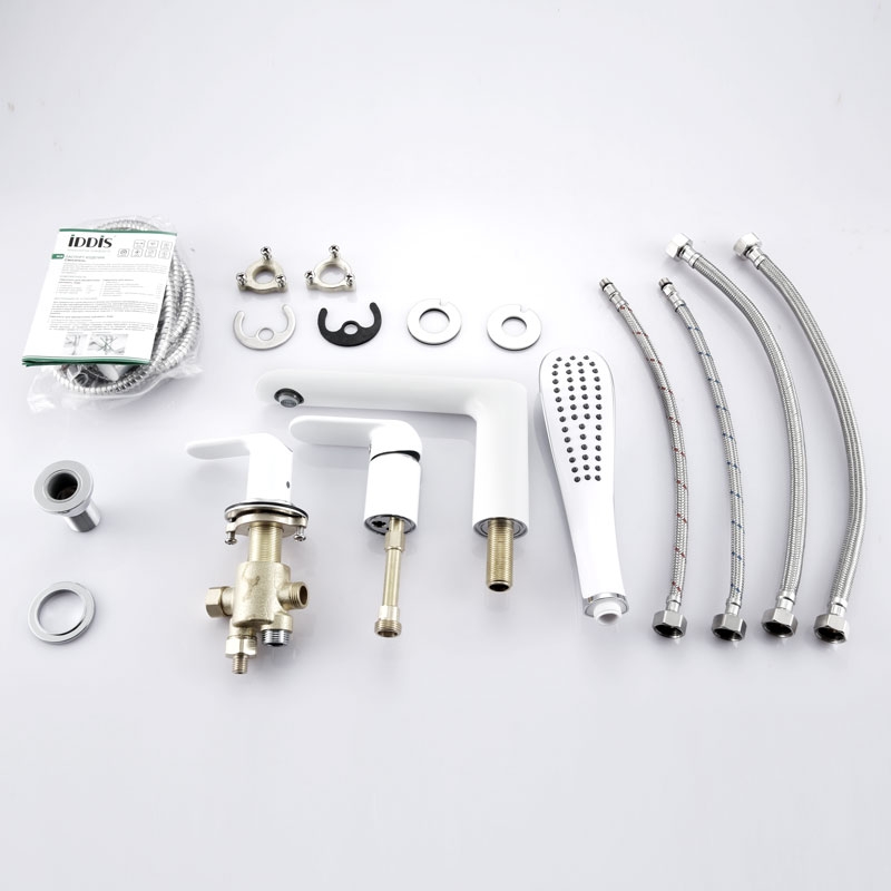 В комплектекерамический картридж, душевой шланг, ручной душ, аэратор, смеситель