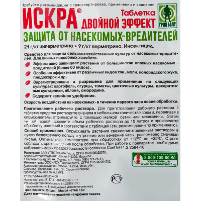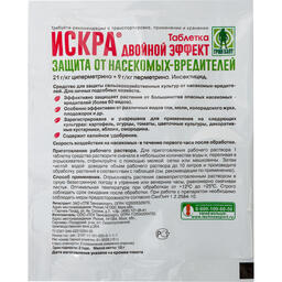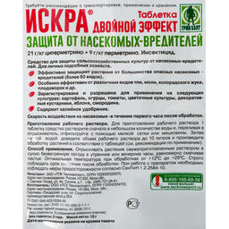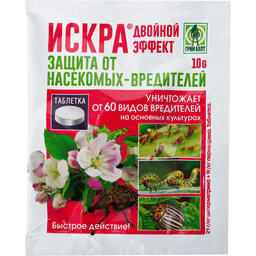 Средство для защиты садовых растений от вредителей «Искра» двойной эффект — контактный инсектицид на основе перметрина и циперметрина. Борется с самыми распространенными садовыми и огородными насекомыми-вредителями (к компонентам препарата чувствительны более 60 видов насекомых). Средство начинает действовать в течение первого часа после обработки.