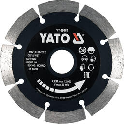 Yato YT-59961 - это отрезной диск, который относится к бытовому классу оборудования. Он характеризуется диаметром 115 мм и посадочным местом 22.2 мм. Прекрасно подходит для резки бетона, гранита, камня, кирпича.