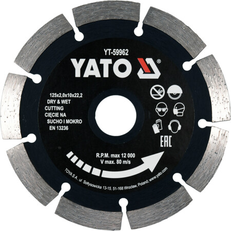 Yato YT-59962 - это отрезной диск, который относится к бытовому классу оборудования. Он характеризуется диаметром 125 мм и посадочным местом 22.2 мм. Прекрасно подходит для резки бетона, гранита, камня, кирпича.