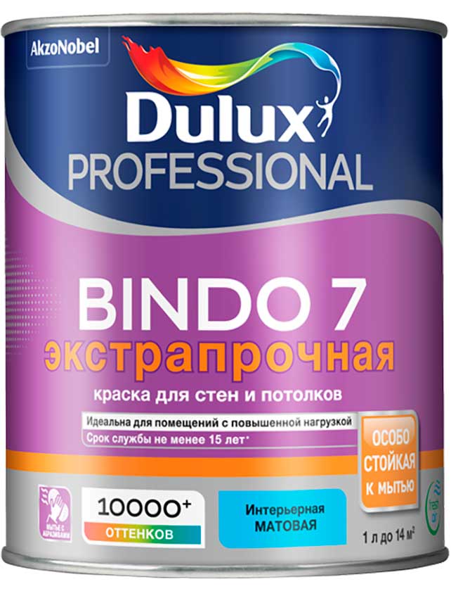 Латексная матовая белая краска DULUX Professional Bindo 7 5309397 предназначена для окраски потолков и стен в помещениях с умеренной влажностью (спальня, гостиная, кабинет, кладовка). Подходит для нанесения на бетон, штукатурку, кирпич, гипсокартон, обои под покраску. Сертифицирована для применения в детских и лечебно-профилактических учреждениях. Скрывает мелкие дефекты поверхности, делая ее более ровной. Легко наносится, без брызг и подтеков. Ориентировочный расход составляет до 14 м2/л. Объем — 4,5 л. 1 класс износостойкости. База BW может применяться самостоятельно без колеровки, а также помогает получить более светлые и постельные оттенки при колеровке.