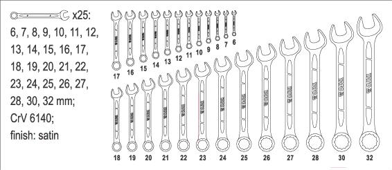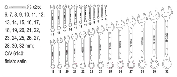 • Размер(ы) ключа (мм) 32, 13, 14, 15, 17, 19, 20, 22, 24, 27, 30, 10, 11, 12, 18, 16, 8, 9, 21, 23, 6, 7, 28, 25, 26