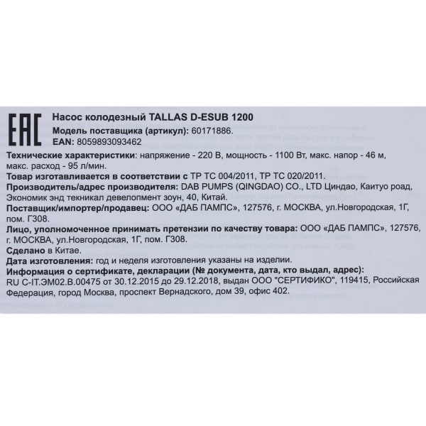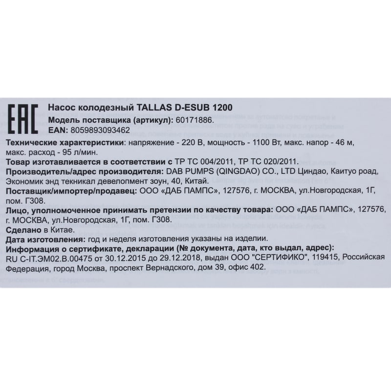 Насос погружной Tallas D-Esub 1200 5700 л/час для чистой воды