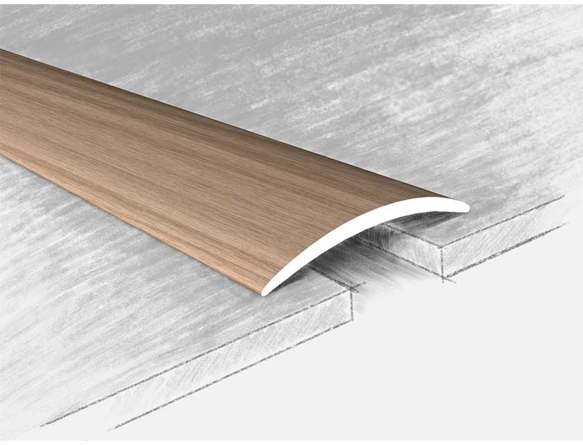 Полукруглый порог из ламинированного алюминия шириной 28 мм с открытым креплением. Имеет продольную жесткость. Применяется для соединения стыков между плиткой, линолеумом, ламинатом, паркетом, ковролином с перепадом до 5 мм.