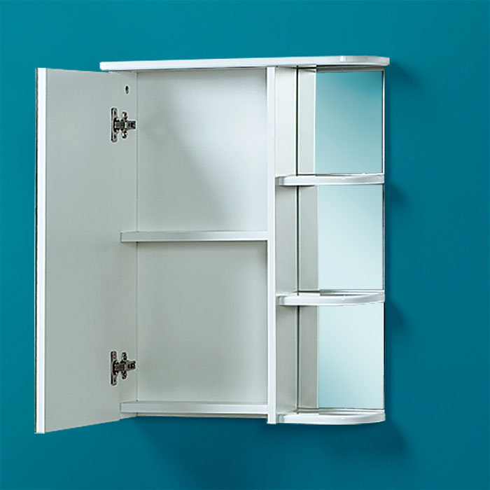 Полка зеркальная ЭМИЛИ 55 выполнена из ДСП и МДФ с влагостойким покрытием. Имеет лаконичный дизайн с закрытыми полками, большим зеркалом и тремя открытыми полками. Материал стенок шкафчика устойчив к воздействию влаги и подходит для размещения в ванной комнате. Глянцевая поверхность гармонирует как с белой, так и с цветной плиткой. Зеркало не искажает отображение и устойчиво к сколам и царапинам.