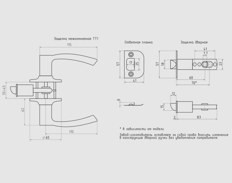 Комплект из 2 ручек с механизмом - готовое решение для комплектации межкомнатных дверей! Универсальные, подходят на левые и правые двери. Модификация 01-ключ/фиксатор, 03-фиксатор (для сантехнических дверей), 05-без запирания (для проходных дверей). Регулируемый бэксет 60-70мм. Высокий ресурс работы - более 1,5 млн циклов. Сертифицированы на соответствие требованиям ГОСТ. Комплект выполнен из легких современных сплавов, ручки покрыты гальваническим способом в 5 слоев. Гарантия на работу механизма 5 лет.