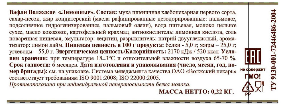 • Ингредиенты Вода питьевая, мука пшеничная хлебопекарная первого сорта, сахар, жир кондитерский (рафинированные дезодорированные растительные масла в натуральном и модифицированном виде, антиокислитель: концентрат смеси токоферолов), сыворотка молочная сухая, масло кокосовое, ароматизатор, эмульгатор: лецитин, краситель пищевой, регулятор кислотности: лимонная кислота, соль, разрыхлитель: гидрокарбонат натрия.