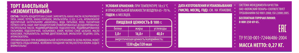 - Ингредиенты Глазурь кондитерская (сахар, заменитель масла какао нетемперируемый лауринового типа, какао порошок, ароматизаторы: Ванилин, Шоколад, эмульгаторы: лецитин соевый, эфиры полиглицерина и взаимоэтерифицированных рициноловых кислот), мука пшеничная хлебопекарная первого сорта, вода питьевая, сахар, жир кондитерский (рафинированные дезодорированные растительные масла), изюм, молоко сухое цельное, масло кокосовое, разрыхлитель: натрий двууглекислый, эмульгатор: лецитин, соль экстра (содержит противослеживающую добавку: ферроцианид калия), ароматизаторы.