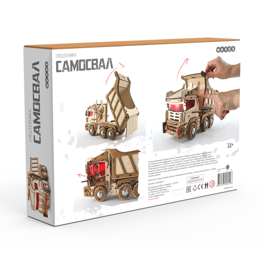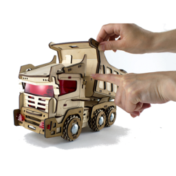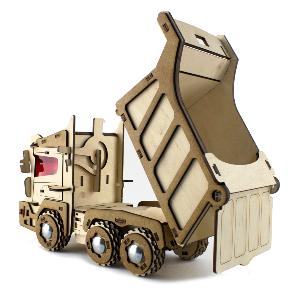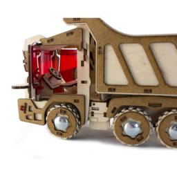 Набор собирается около часа и позволяет ощутить себя настоящим конструктором, создающим нечто значимое для рабочих объектов. Корпус самосвала выполнены из микса надежных материалов: древесины, МДФ, полупрозрачного пластика (оргстекла) и хромированного метала.