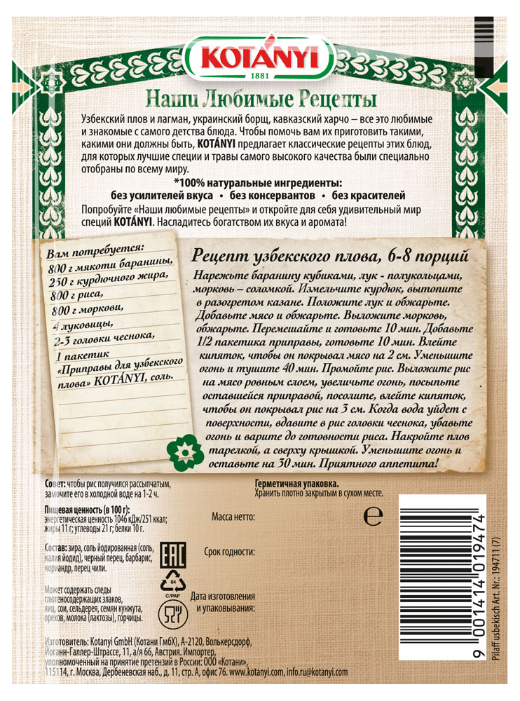 - Ингредиенты Зира, соль йодированная (соль, калия йодид), черный перец, барбарис, кориандр, перец чили. Пищевая ценность в 100 г: энергетическая ценность: 1063 кДж/253 ккал, белки 9,8 г, жиры 11 г, углеводы 25 г.