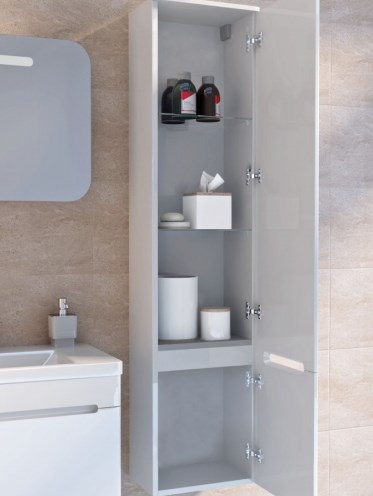 - Конструкция Шкафы отличаются между собой не только габаритами, материалом и дизайном, но и конструкционными особенностями. В зависимости от них выделяют следующие виды шкафов: • с распашными дверками: классический вариант. Чаще всего такие шкафы оснащены одной или несколькими внутренними полками; • с выдвижными ящиками: они обеспечивают удобное хранение различных аксессуаров и эргономичность в использовании; • с открытыми полками: могут дополнять конструкцию шкафов с выдвижными ящиками или распашными дверками. Открытые полки могут использоваться как для хранения необходимых ванных принадлежностей, так и для декоративного оформления помещения с помощью дизайнерских аксессуаров; • с откидной вниз дверкой: чаще всего такие изделия оснащены практичной корзиной для белья. Такой шкаф не только удобен в эксплуатации, но и значительно экономит место в ванной комнате. Конструкция с распашными дверками