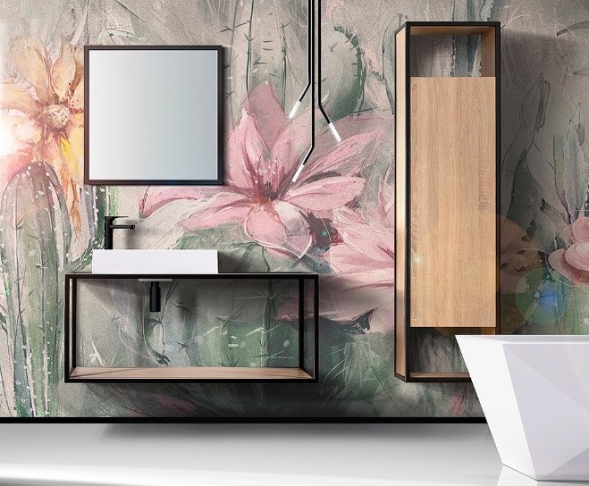 • с открытыми полками: могут дополнять конструкцию шкафов с выдвижными ящиками или распашными дверками. Открытые полки могут использоваться как для хранения необходимых ванных принадлежностей, так и для декоративного оформления помещения с помощью дизайнерских аксессуаров;