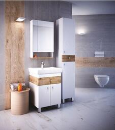 • навесной шкаф: небольшой, но вместительный элемент мебели, который монтируется на стену с помощью специальных крепежей. Шкаф может оснащаться распашными или откидными вверх/вниз дверцами, а также выдвижными ящиками. Настенный монтаж позволяет устанавливать навесной шкаф в небольших ванных комнатах;