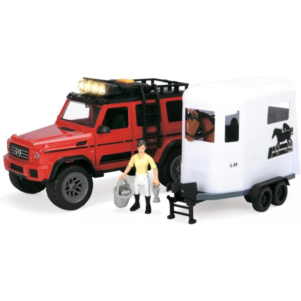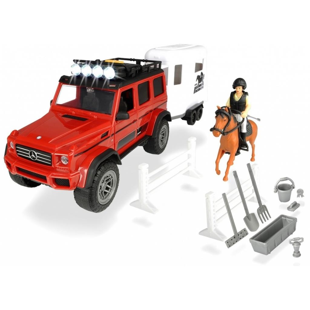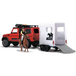 Мрієте про кінну прогулянку? Тоді вам терміново потрібен набір Dickie Toys для перевезення коней серії PlayLife . До набору входить автомобіль MB AMG 500 4x4 зі світлом і звуком, відкривними дверима й багажником, а також причіп для перевезення коней. У причепі перебуває кінь. Фігурка вершниці з рухомими руками та ногами легко сідає на коня для кінної прогулянки. Для тренування коня передбачені бар'єри. До набору входять аксесуари для повноцінної гри.