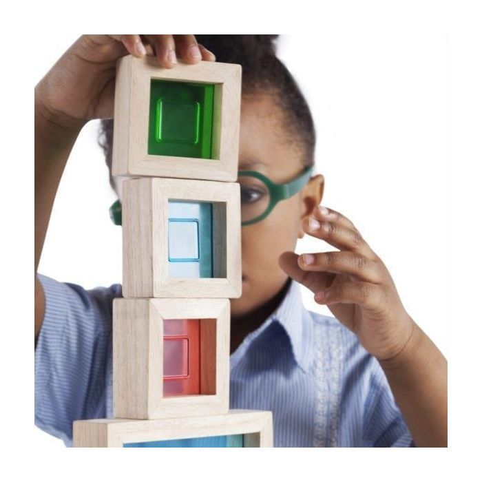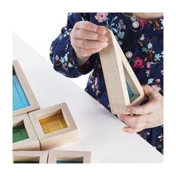 Набір з будівельних блоків у вигляді геометричних фігур з рамами з масиву дерева і пластиковими кольоровими вставками 4 кольорів (синій, червоний, жовтий, зелений). У комплекті 10 блоків: 4 прямокутника, 2 квадрата, 2 трикутника і 2 півкола (півмісяця). Розміри блоків: 14х7х3,5 см.
