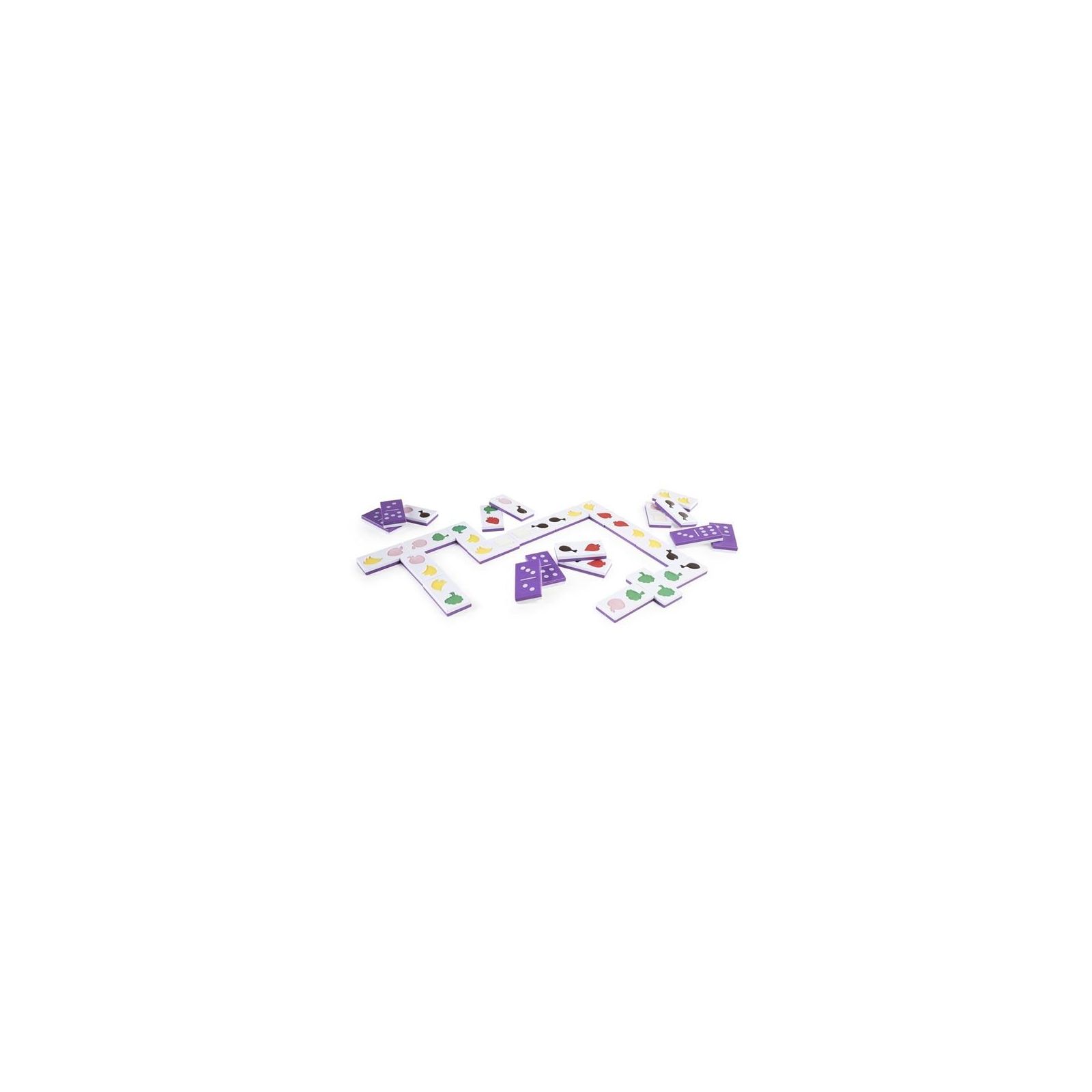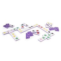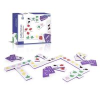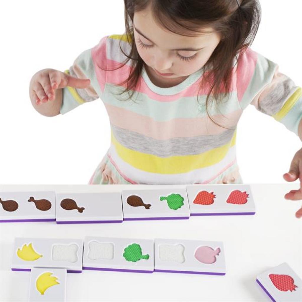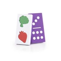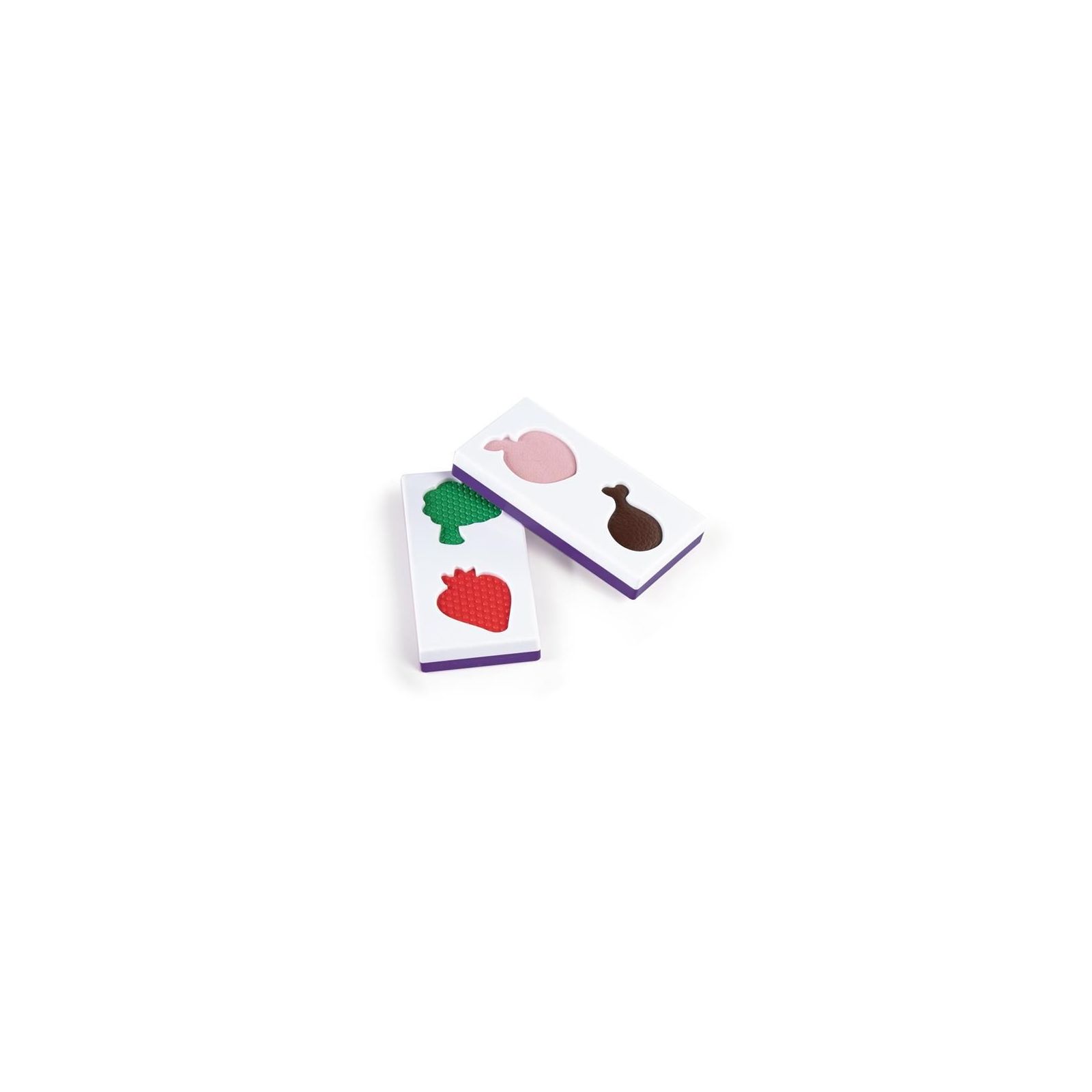 Доміно – ідеальний спосіб допомогти дітям розвинути тактильні відчуття і зорове сприйняття. У комплекті 28 двосторонніх доміно: з одного боку крапки, а з іншого – обриси продуктів харчування, всі різних кольорів і текстур: курячі ніжки, скибочки хліба, банани, полуниця, броколі та персики. Чудово добре підходить для розвитку візуальних і тактильних навичок, ігри, вивчення сортування, послідовності, промовляння і запам'ятовування назв продуктів.