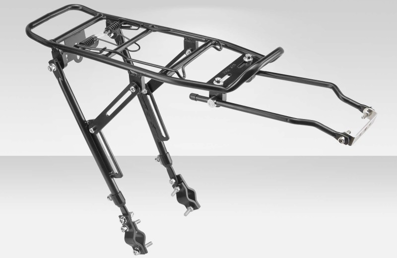 Универсальный разборный багажник. Регулировка высоты стоек с универсальными креплениями.Для велосипедов 24”-28”. Материал: алюминий.Цвет: чёрный.