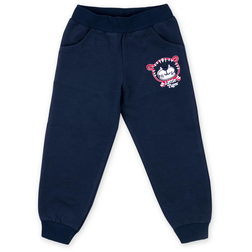 Світшот з довгим рукавом, що закінчується манжетом в «резинку». Класичний круглий виріз горловини також оформлений резинкою. На лівому плечі застібка на три гудзики, яка полегшить процес одягання. Симпатична яскрава мордочка тигрика з елементами вишивки та аплікації на світшоті, і аналогічна, контрастного кольору на брюках, прикрашає цей дитячий костюмчик в спортивному стилі.