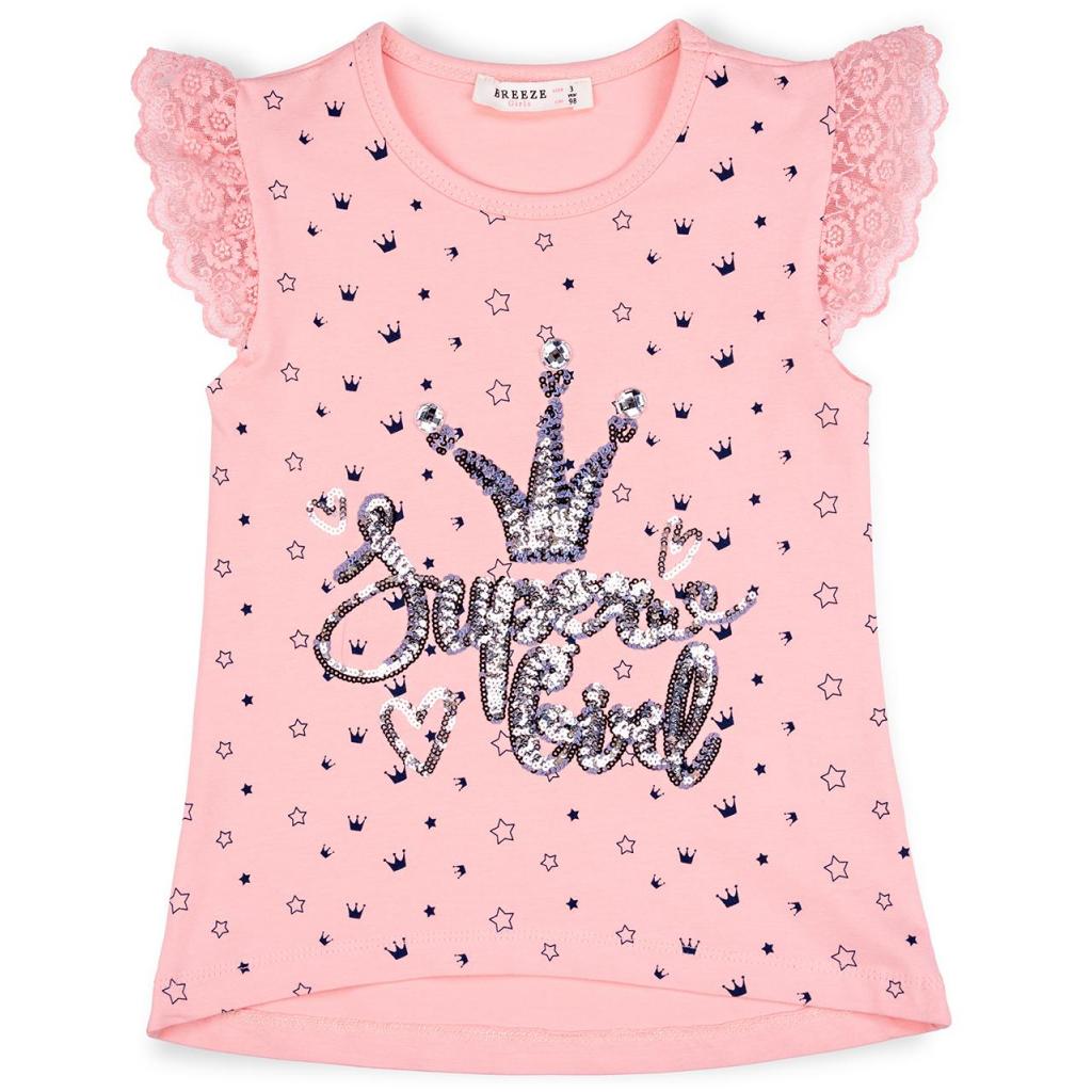 Симпатична літня маєчка А-силуету, з асиметричною лінією низу (перед коротший за спинку на 4 см). Прикрашена класною об'ємною аплікацією у вигляді корони, написом «Super Girl» та милими сердечками, вишитими по трикотажу блискучими сріблястими і чорними паєтками. По проймах вставлені короткі, призібрані рукавчики-крильця з ніжного ажурного мережива. Овальна горловина оброблена трикотажною бейкою.