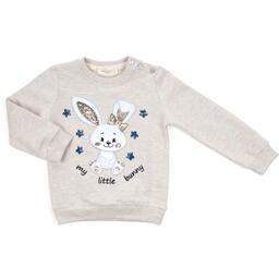 Світшот дуже затишний, прямого силуету, з довгими рукавами, прикрашений яскравою об'ємною аплікацією зайчика з хутра. Аплікація дуже красиво оформлена блискучими паєтками і сріблястим люрексом. Кругла горловина, манжети рукавів і низ світшоту оброблені подвійною якісною трикотажною «гумкою». На лівому плечі застібка на перламутрові ґудзики, яка полегшить процес одягання (для р-рів 80, 86 і 92).