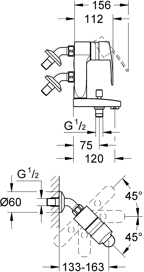 Смеситель для ванны/душа, однорычажный, запорный механизм керамический картридж, излив: поворотный, монтаж настенный, кол-во монтажных отверстий 2, материал корпуса латунь.