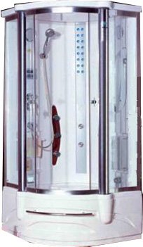 Душевая кабина размером 95x95х225 см. Материал шторок: безопасное годубое стекло толщиной 5 мм. Поддон высотой 46 см с удобным сиденьем. Функции: вертикальный гидромассаж (8 форсунок), гидромассажная панель для ног, тропический душ с подсветкой, ручной душ, вентиляция. Также есть каскадный смеситель для наполнения поддона, FM радиоприемник, точка подключения телефона.