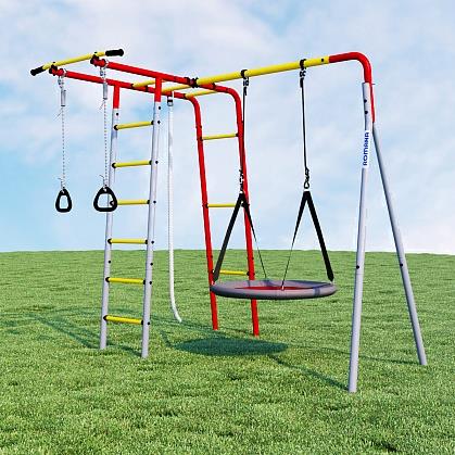 • Элементы комплекса в комплекте качели, турник, канат, кольца, лестница, рукоход