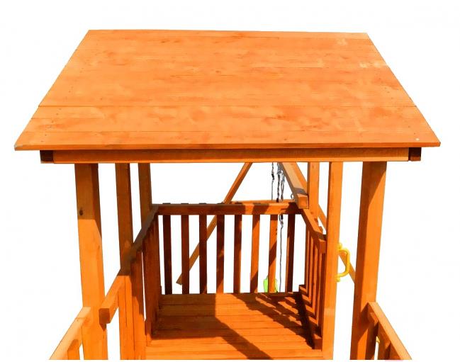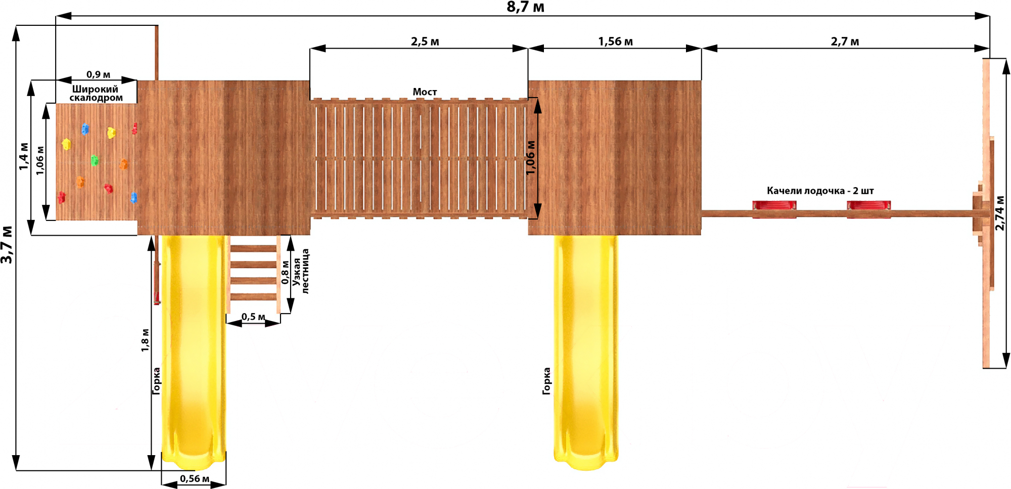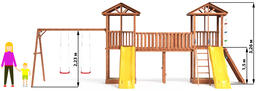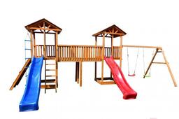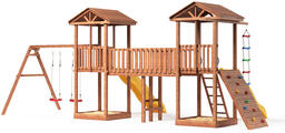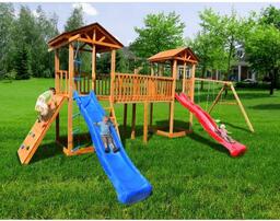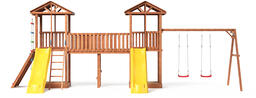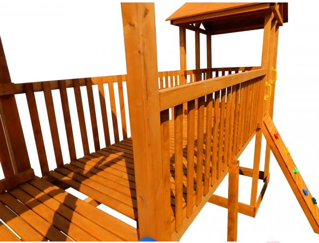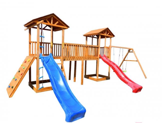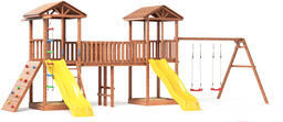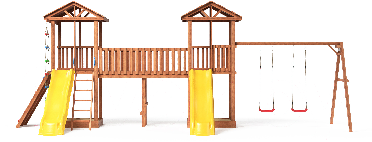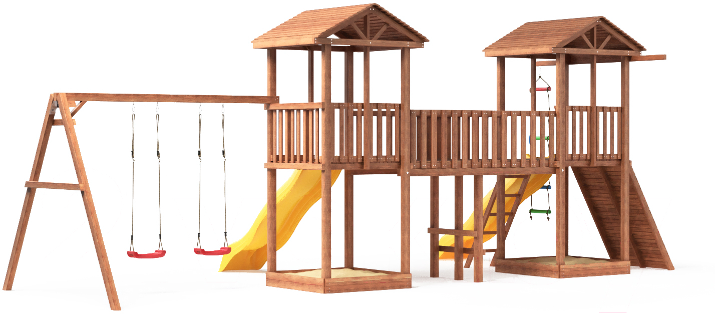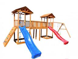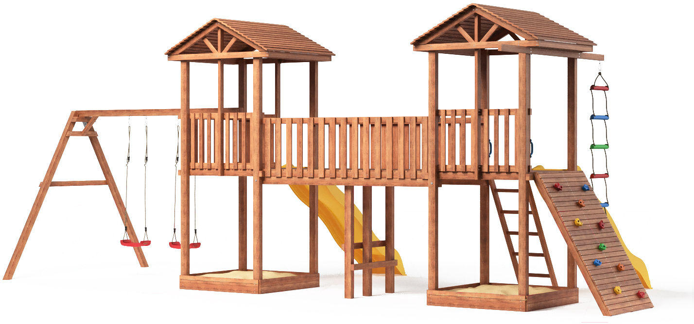• Элементы комплекса в комплекте горка, качели, стена для лазания, веревочная лестница, игровая башня, песочница, лестница