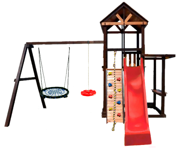 - Элементы в комплекте горка, качели, стена для лазания, игровая башня, канат, тарзанка, лестница