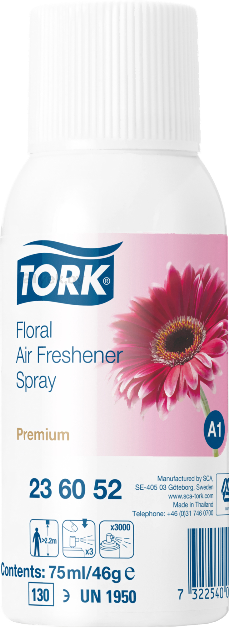 Сменный блок для освежителя воздуха Tork 236052 (с ароматом цветов); Назначение: универсальный, для общественных мест; Форма: аэрозоль; Аромат: цветочный; Объем: 240 мл; Вес: 67 г