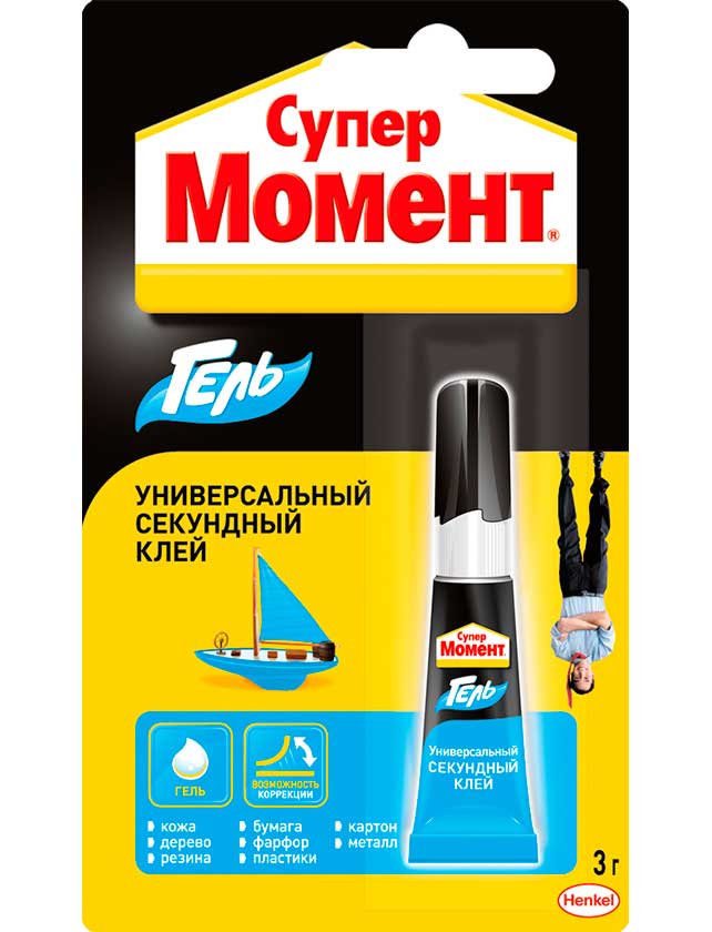 Клей Супер Момент гель используется для всех видов ремонтных работ в быту, мастерской, автомобиле, при конструировании моделей. Мгновенно склеивает фарфор, керамику, дерево, кожу, резину, металл, большинство пластиков. Прозрачный водостойкий клей хорошо растекается, заполняет мельчайшие трещины. Не пригоден для склеивания полиэтилена, стиропора, полипропилена, синтетических тканей. Время фиксации обычно составляет 5-60 секунд. Тюбик с 3 граммами клея упакован в блистерную упаковку.