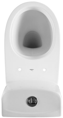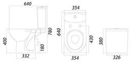 Унитаз-компакт размером 354x780x640 мм. Напольное крепление. Горизонтальный выпуск. Нижний подвод воды. Двухрежимная (3/6 л) сливная арматура.