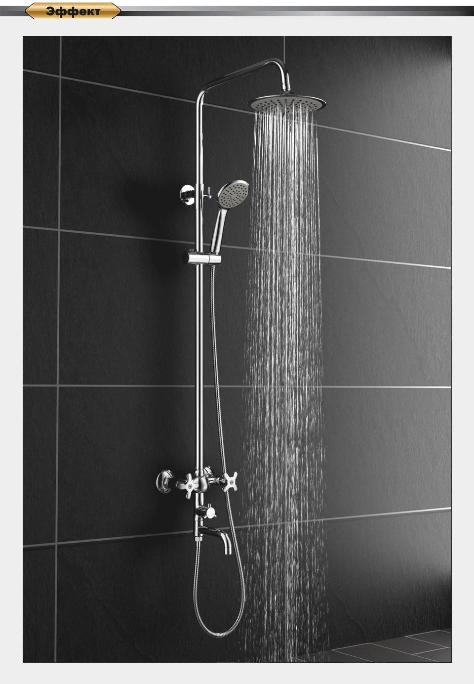 Регулировка высоты верхнего душа Функция регулировки по высоте позволяет подобрать необходимое расстояние от основания ванны, душевого уголка или кабины до верхней лейки. Оптимальная высота зависит, прежде всего, от роста пользователя. Регулировка высоты верхнего душада