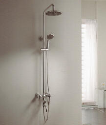 Душевые стойки и панели могут выполняться из латуни, нержавеющей стали и алюминия. Кроме того, довольно популярными материалами для изготовления душевых панелей являются закаленное стекло и акрил.