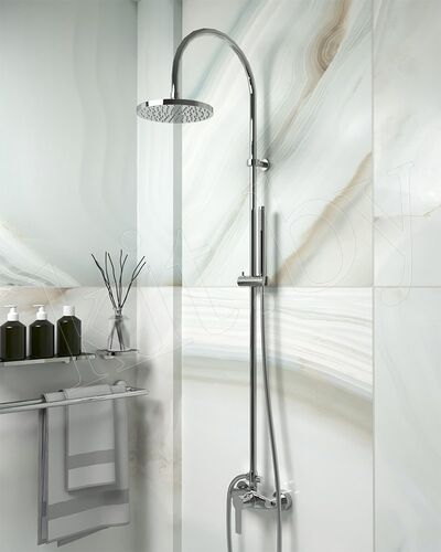 - Материал изделия Душевые стойки и панели могут выполняться из латуни, нержавеющей стали и алюминия. Кроме того, довольно популярными материалами для изготовления душевых панелей являются закаленное стекло и акрил. Материал изделия латунь