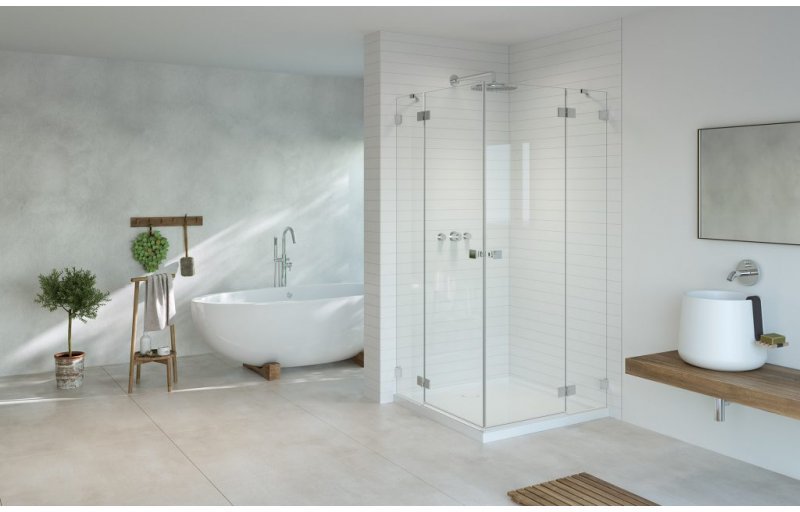 – коллекция кабин разных форм, дверей и шторок, в которых стационанрое стекло закреплено к стене с помощью кронштейна, а не профиля. Допустимы два варианта монтажа: с уплотнительным профилем, или без него. Створка двери подвешена на латунных петлях и открывается только наружу.