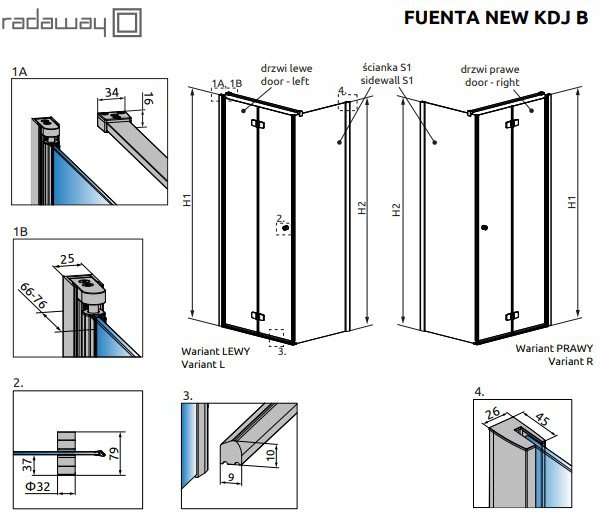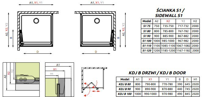 Квадратная кабина со сдвижной дверью: дверь KDJ B и боковая стенка S1