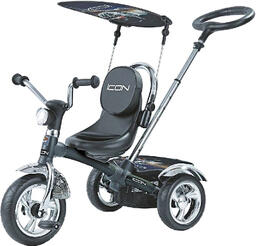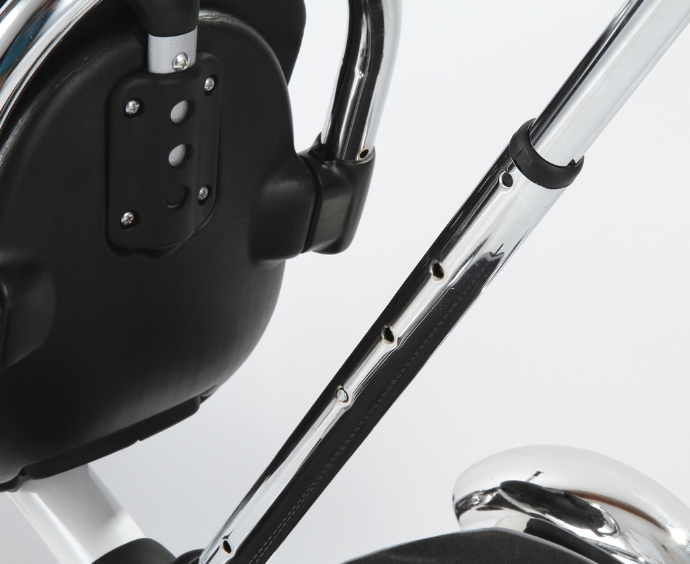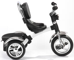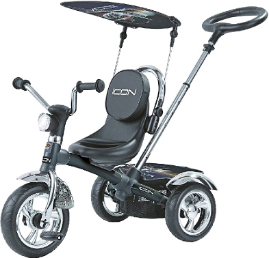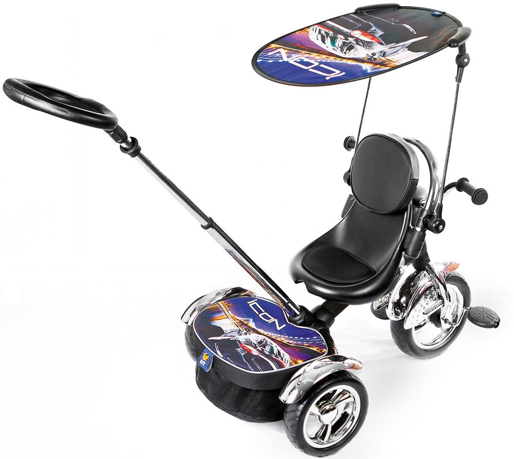 Трехколесный велосипед для детей. Ручка для родителей. Передний щиток. Корзина. Сиденье достаточно большого размера, его положение можно менять, двигая по полозьям: полулежа, лежа, лицом к маме (всего 8 положений). Удобная длинная телескопическая ручка изделия регулируется нажатием на деталь в верхней части и имеет оптимальный угол наклона для взрослых.