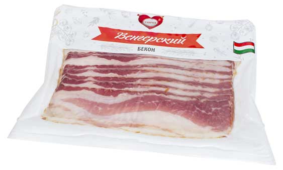 «Бекон Венгерский» это лакомые кусочки мяса со вставками нежного сала, прошедшие копчение на натуральной буковой щепе и приправленные ароматными специями. «Венгерский» в нарезке уже готов к употреблению, но некоторые все же предпочитают поджарить тонкие кусочки, чтобы получить золотистый цвет и хрустящую корочку по краям. Свой вкус бекон раскрывает в сочетании с орехами, листьями салата, петрушкой или тимьяном.