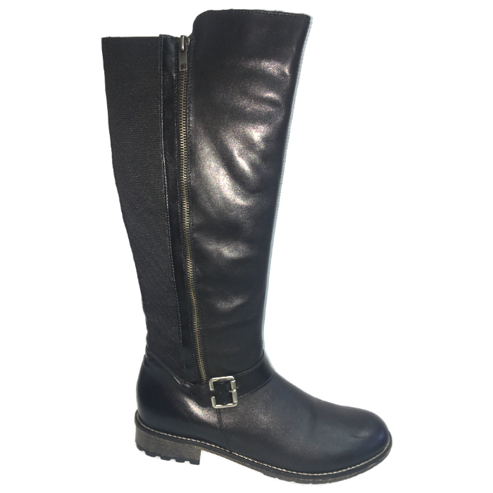 Сапоги женские черные кожаные. Текстильная подкладка и шерстянная стелька. Сбоку молния. По всей длине голенища широкие резиновые вставки. Подошва 1 см, каблук 3 см. Высота 40 см, обхват 40 см. Длина стельки в 41 размере 27 см. Remonte, Германия.