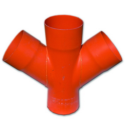 Соединение четырёх гибких, жестких, дренажных гофрированных двустенных труб одного диаметра и отвод под углом 45°.