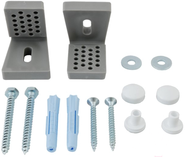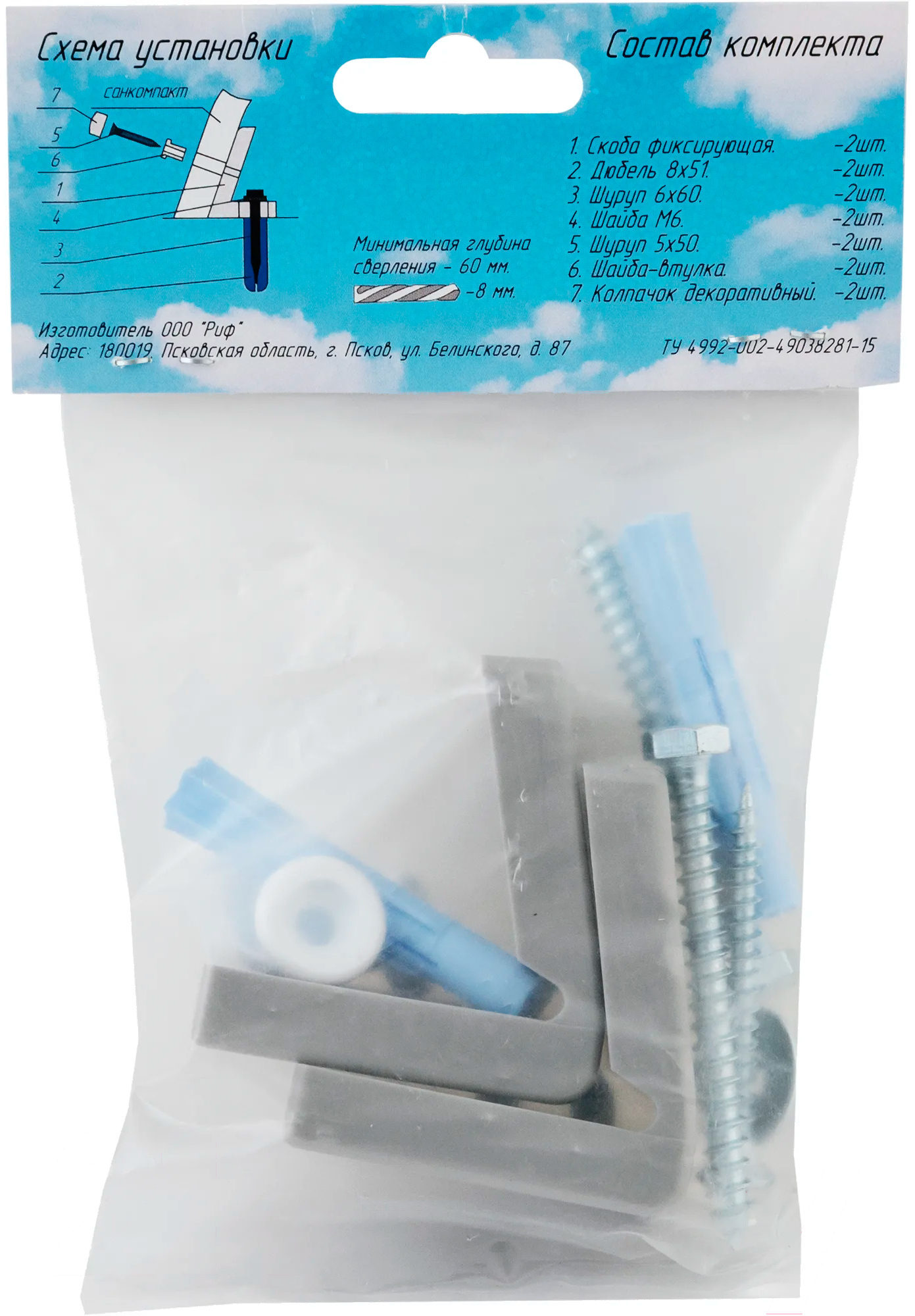 - Комплектация защитная втулка (2 шт.), дюбель (8×61, 2 шт.), скоба монтажная (2 шт.), шуруп (2 шурупа 6 × 60; 2 шурупа 5 × 50), шайба (2 шайбы М6; 2 шайбы-втулки), декоративный колпачок (2 шт.)