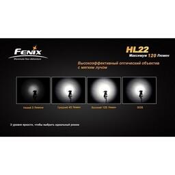 Модернізований мініатюрний налобний ліхтар Fenix HL22 на базі світлодіода XP-E R4 зі світловим потоком в 120 люмен. Легкий в усіх відношеннях, невибагливий і продуктивний освітлювальний прилад, що працює на 1 АА батареї до 55 годин. Управління в цілому максимально спрощено і гранично комфортно. Всі операції проводяться за допомогою однієї функціональної кнопки, а можливість голови нахилятися на 60 ° щодо кріплення дозволяє максимально точно відрегулювати область освітлення під свої потреби. У моделі реалізована зручна триступенева градація яскравості: High (120 люмен), Mid (45 люмен), Low (3 люмен); також присутній режим подачі сигналу SOS. Особливості • Світлодіод: XP-E R4 • Діяльність променя: 90 м • Відбивач: гладкий • Водонепроникність: IPX-6 • Режим SOS • 3 режими яскравості Характеристики • Світлодіод Cree XP-E (R4) • Серія HP • Світловий потік, лм 120 • Діяльність, м 90 • Елементи живлення AA • Режими яскравості 3 • Вага, г 44,6 • Водонепроникність IPX-6 • Матеріал корпусу пластик, авіаційний алюміній • Тип налобний • Призначення для полювання, для риболовлі, туристичний, для велосипедистів