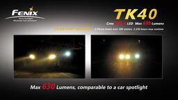 Fenix TK40 - перший пошуковий ліхтар-фара в лінійці ліхтарів Fenix. Потужний ліхтар з розширеним кількістю режимів мигання спеціально створений для пошукових, рятувальних та екстремальних умов. Для максимально ефективності розпізнавання сигналів на далеких дистанціях встановлено спеціальний режим sos - чергування сигналів зі спалахом турбо потужності. Спеціальний дизайн корпусу забезпечує не тільки максимальну зручність користування, а й захист від скочування з похилих поверхонь. Завдяки плоскій формі торця ліхтаря, він може встановлюватися як свічка. Водонепроникність, підвищена ударостійкість, гартоване скло з покриттям антивідблиску, запам'ятовування останнього режиму, цифрове регулювання яскравості забезпечують ефективне і надійне використання Fenix TK40 в будь-яких складних умовах. Ліхтар Fenix K40 рекомендований для: • Туристичних походів • Полювання • Автомобілістів • Пошукових робіт Технічеcкіе характеристики: світлодіод - (LED) Американський CREE MC-E ресурс роботи більше - 50 000 годин максимальна потужність - 630 люмен дальність променя - 275 м час роботи - 150 годин режими яскравості - 4: 630 люмен (2 ч), 277 люмен (6 год 40 хв), 93 люмена (20 год), 13 люмен (150 ч) режими миготіння - 4: Strobe (630 люмен), чергове миготіння (277 люмен), sos (93 люмена), аварійні спалахи (13 люмен) розміри - 200 мм (довжина) х 40 мм (діаметр) х 62 мм (голова) вага - 284 г (без елементів живлення) елементи живлення - 8хАА або 4хАА (часткове завантаження касети) (батареї, акумулятори) корпус - авіаційний алюміній покриття - анодування III (вищої) ступеня жорсткості оптична система - текстурований рефлектор водонепроникність - IPX8 - захист при повному і тривалому зануренні у воду на глибину понад 2 м ударостійкість - 1,5 м кольори - чорний комплект - ремінь для носіння ліхтаря через плече, шнурок, запасні ущільнювальні кільця, пластиковий кейс, запасна накладка на кнопку, сталеве кільце