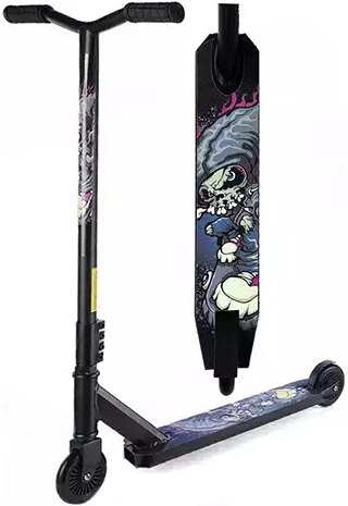 Трюковой самокат. Материал рамы: алюминий. Высота руля 83 см. Размеры деки: 48x10 см. Колеса: PU, 100 мм. Подшипники: ABEC 9. Ножной тормоз. Максимальный вес пользователя: 100 кг.