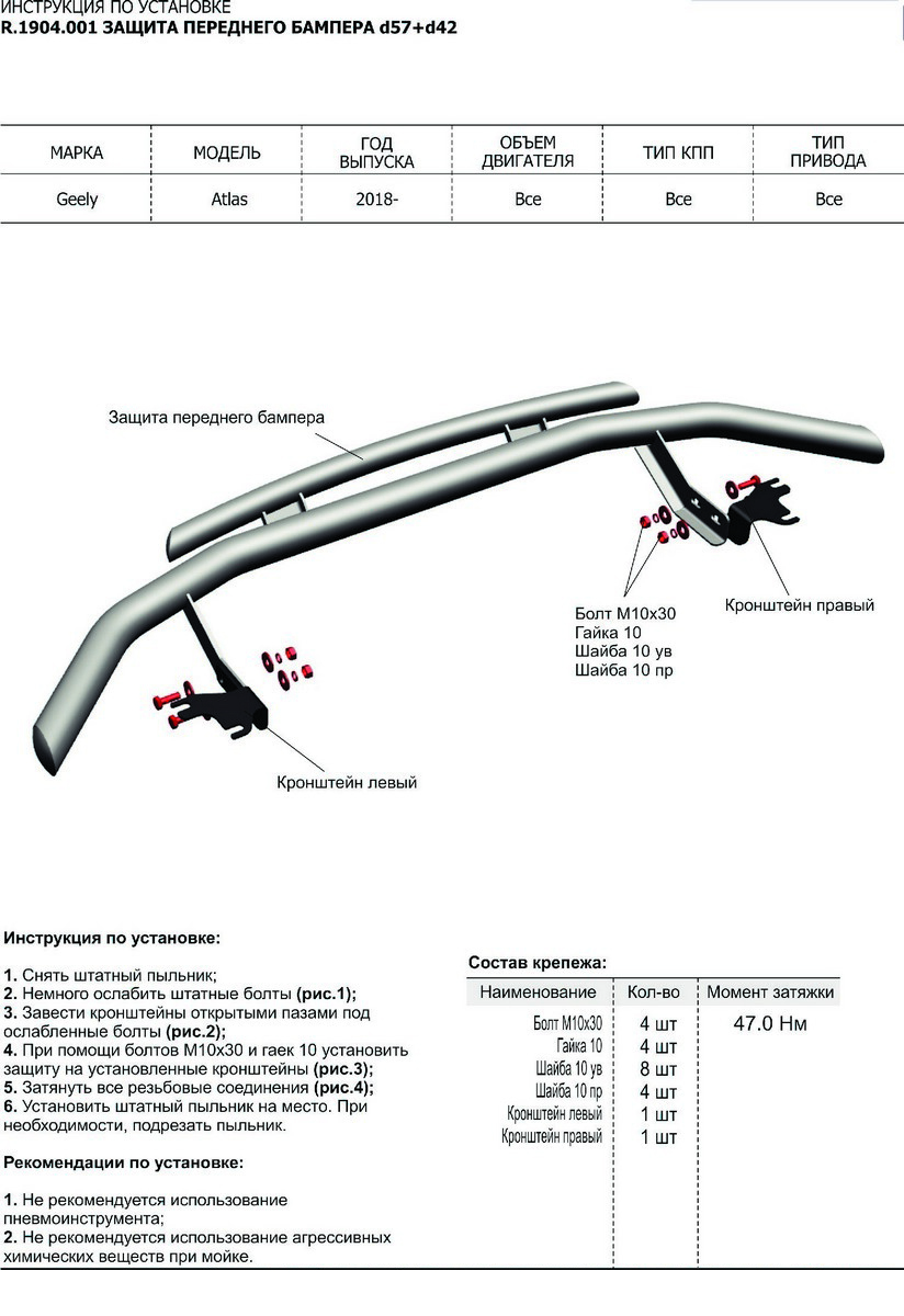 Защита переднего бампера d57+d42 Rival для Geely Atlas I 2018-н.в., нерж. сталь, R.1904.00