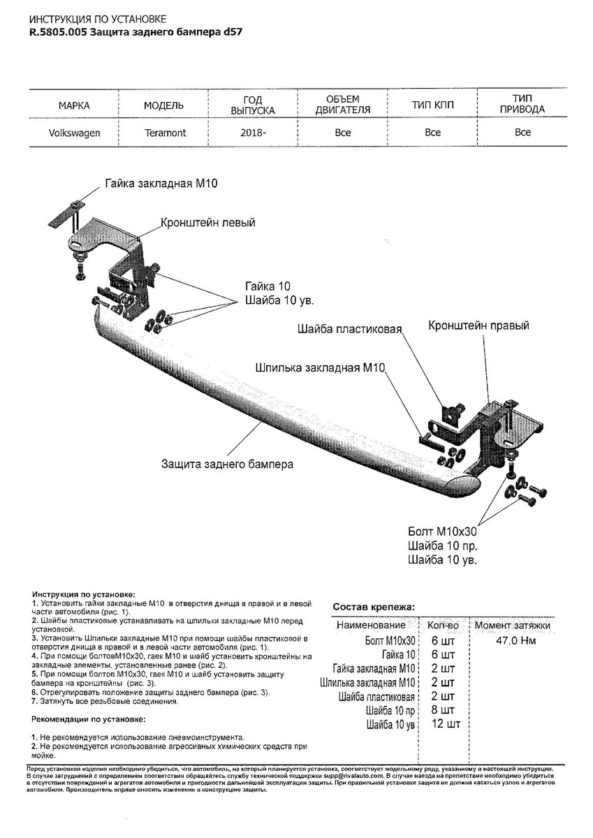 Защита заднего бампера d57 Rival Volkswagen Teramont I 2018-н.в., нерж. сталь, R.5805.005