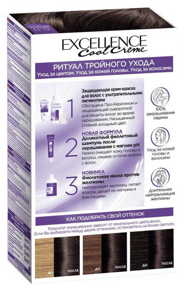 Стойкая крем-краска для волос Excellence Cool Crème – это тройной уход и 100% закрашивание седины. Excellence Cool Crème – это бренд внутри бренда! Среди продуктов коллекции Cool Crème есть ультрапепельные оттенки как для блондинок, так и для брюнеток! Тройной уход крем-краски заключается в инновационных формулах. Уход за цветом, уход за кожей головы, уход за волосами. 1. Крем-краска защищает волосы. В уникальный состав входят: коллаген, который уплотняет волосы, керамиды, которые закрывают кутикулы и позволяют получить более долгий и стойкий результат окрашивания, технология про-кератин, которая восстанавливает повреждения волос. 2. Фиолетовый шампунь с мягким pH не только восстанавливает кожу голову после окрашивания, но и способствует нейтрализации желтизны. 3. Фиолетовая маска питает волосы и нейтрализует желтизну благодаря высокой концентрации фиолетовых пигментов. В состав упаковки входит: флакон крем-краски, флакон-аппликатор с проявляющим кремом, фиолетовый шампунь, фиолетовая маска, инструкция, пара перчаток. Прочитайте и строго следуйте инструкции. Не подходит для самостоятельного применения лицами моложе 16 лет.