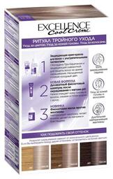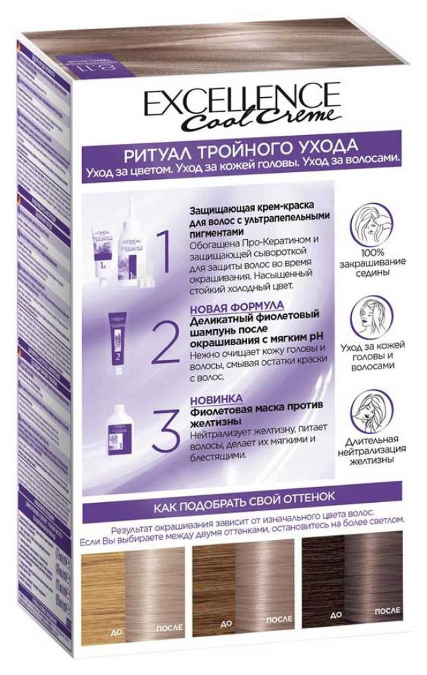 Стойкая крем-краска для волос Excellence Cool Crème – это тройной уход и 100% закрашивание седины. Excellence Cool Crème – это бренд внутри бренда! Среди продуктов коллекции Cool Crème есть ультрапепельные оттенки как для блондинок, так и для брюнеток! Тройной уход крем-краски заключается в инновационных формулах. Уход за цветом, уход за кожей головы, уход за волосами. 1. Крем-краска защищает волосы. В уникальный состав входят: коллаген, который уплотняет волосы, керамиды, которые закрывают кутикулы и позволяют получить более долгий и стойкий результат окрашивания, технология про-кератин, которая восстанавливает повреждения волос. 2. Фиолетовый шампунь с мягким pH не только восстанавливает кожу голову после окрашивания, но и способствует нейтрализации желтизны. 3. Фиолетовая маска питает волосы и нейтрализует желтизну благодаря высокой концентрации фиолетовых пигментов. В состав упаковки входит: флакон крем-краски, флакон-аппликатор с проявляющим кремом, фиолетовый шампунь, фиолетовая маска, инструкция, пара перчаток. Прочитайте и строго следуйте инструкции. Не подходит для самостоятельного применения лицами моложе 16 лет.